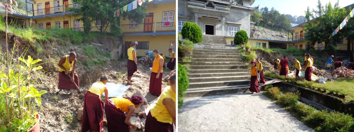 Es hat endlich aufgehört zu regnen. Der Monsun hat auch beim Kloster Schäden angerichtet. So ist ein Hang neben dem Tempelneubau abgerutscht. Das musste schnell repariert werden. Da waren alle Hände gefragt.