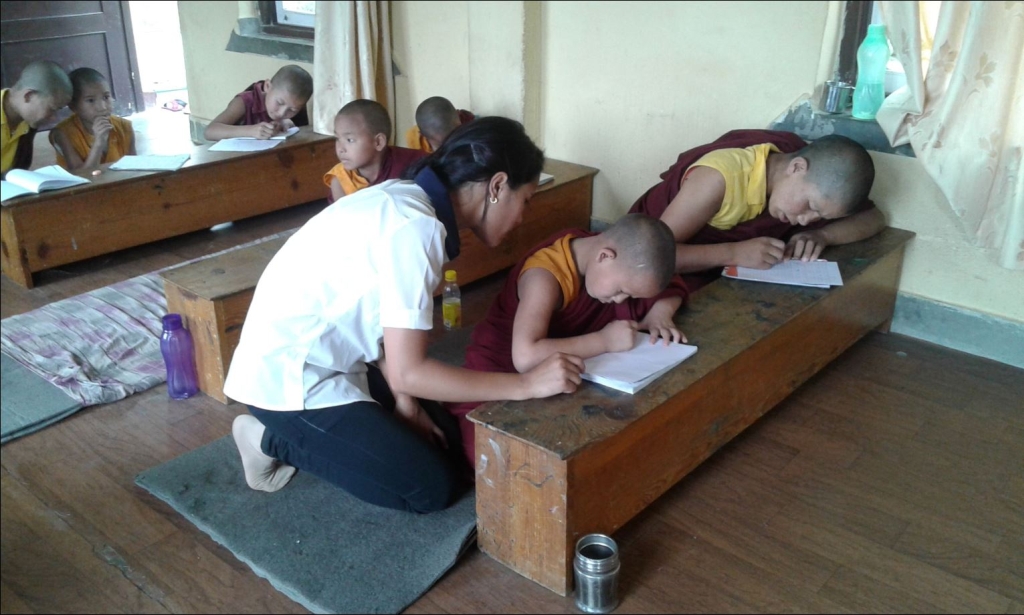Die beiden Studentinnen sind am NTTCM am Vormittag von 5 bis 11 Uhr. Dann, nach dem Mittagessen gehen sie ins Kloster und unterrichten von 13 bis 16 Uhr. Die Unterstufe mit 26 Schülerinnen unterrichten sie gemeinsam, was auch Sinn macht. Die Fortgeschrittenen werden je nach Leistungsstand getrennt unterrichtet. Wir haben eine großzügige Spende für Unterrichtsmaterial bekommen (lieben Dank, Michaela), so dass Hefte, Schreibutensilien usw. angeschafft werden konnten.