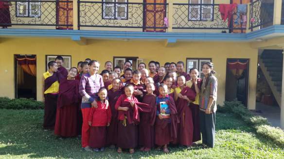 Mit Ven. Khenpo Karma Yeshe hat sie die Lehrbücher für dieses neue Unterrichtsfach besorgt.