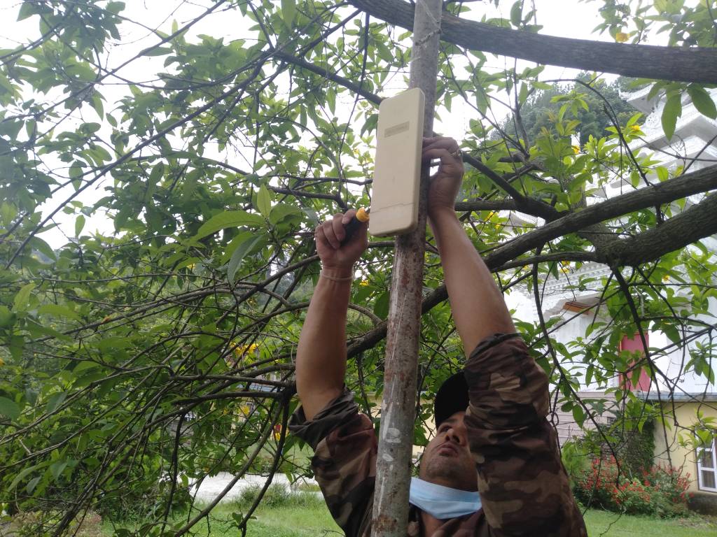 Der nächste Schritt war, zu klären, ob das WLAN für eine Ausweitung ausreicht. Nachdem Ende Juni der Lockdown etwas gelockert wurde, konnte die entsprechende Technik montiert werden. Khenpo schrieb dazu: „Wir konnten gute neue Internetvorrichtungen für den Unterrricht beschaffen, nachdem wir uns von einem Techniker des Nepali WLAN Broadband Internet Service beraten ließen, wie wir es verbessern können. Es ist sehr gut.“