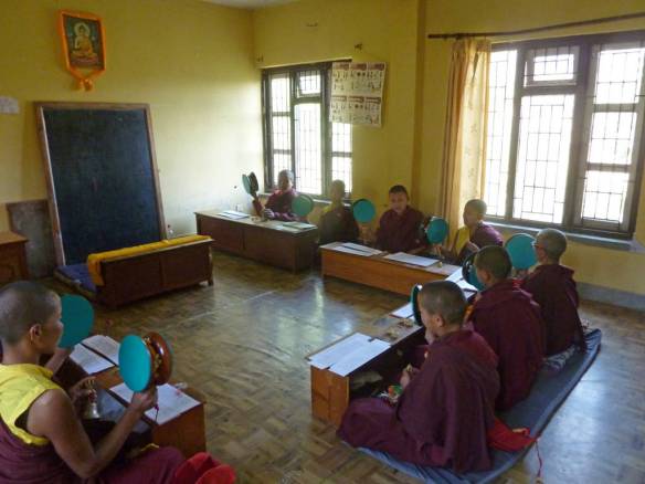Inzwischen stärkten normaler Grün-Tee und Kekse uns für die anschließende Puja in der wunderschönen, bunten, tibetischen Gompa. Es war sehr eigen, exotisch- fremd, die jungen Nonnen gaben ihr Bestes und beeindruckten uns mit Trommeln, Tröten und Zimbeln, die ihre Rezitationen lautstark untermalten. Wir waren sofort gefangen von dieser einzigartigen Atmosphäre. Ein Geschenk!