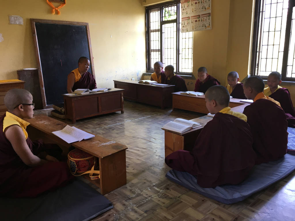 Nach dem Tee führte Khenpo uns durch das Kloster, und wir durften in zwei Klassenzimmer hineinspicken, wo die Nonnen gespannt ihrer Lehrerin zuhörten.
